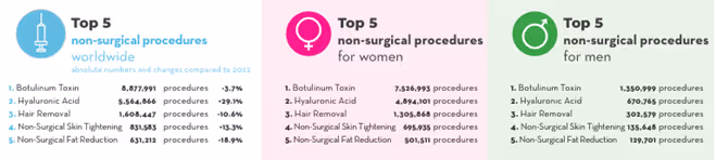 The trends in South Africa closely follow what the rest of the world is seeing. Research from the International Society of Aesthetic Plastic Surgery shows worldwide increases in non-surgical procedures, such as Hyaluronic Acid (+29.1%) and non-surgical skin tightening (+13.3%) up from 2022.
